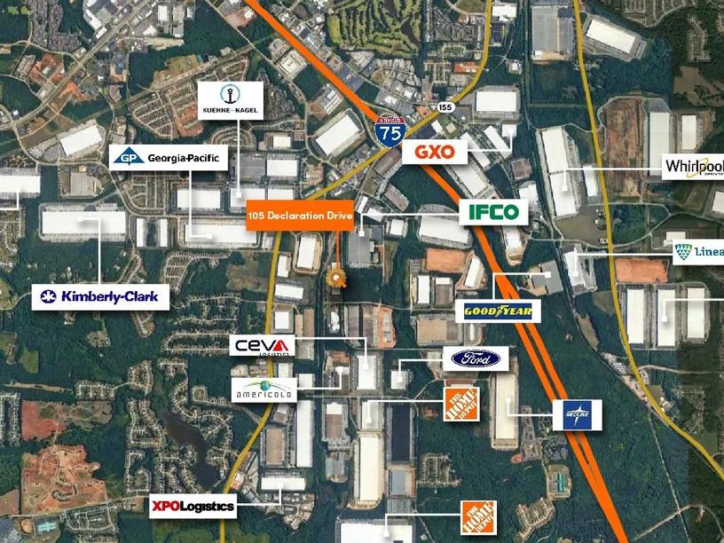 105 Declaration Drive in McDonough, Henry County, is a prime commercial lease opportunity, strategically located just one mile from the I-75 interchange. This property offers excellent access to Atlanta’s major transportation routes, including I-85, making it ideal for logistics and distribution businesses. It serves as a key location for companies looking to access the Atlanta market and beyond, ensuring operational efficiency and market reach.