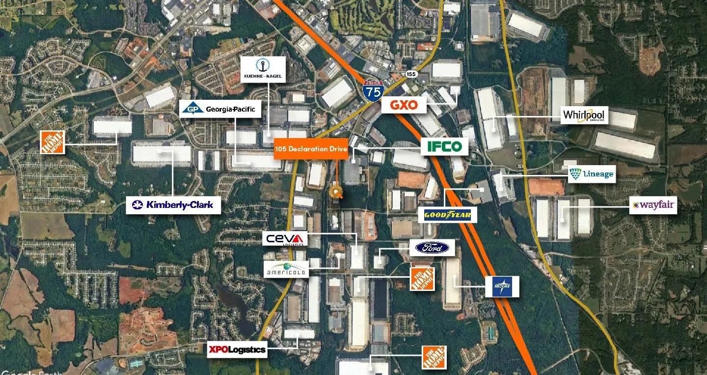 105 Declaration Drive in McDonough, Henry County, is a prime commercial lease opportunity, strategically located just one mile from the I-75 interchange. This property offers excellent access to Atlanta’s major transportation routes, including I-85, making it ideal for logistics and distribution businesses. It serves as a key location for companies looking to access the Atlanta market and beyond, ensuring operational efficiency and market reach.