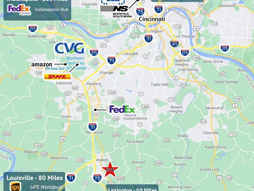 - 201 Richard Knock Highway is located in the heart of Greater Cincinnati’s logistics corridor with immediate proximity to FedEx Ground, Amazon Prime Air Hub, DHL International Hub, CSX, and Norfolk Southern. It boasts easy access to Interstates 75, 71, 74, and 275, with 60% of the US population within a one-day drive.