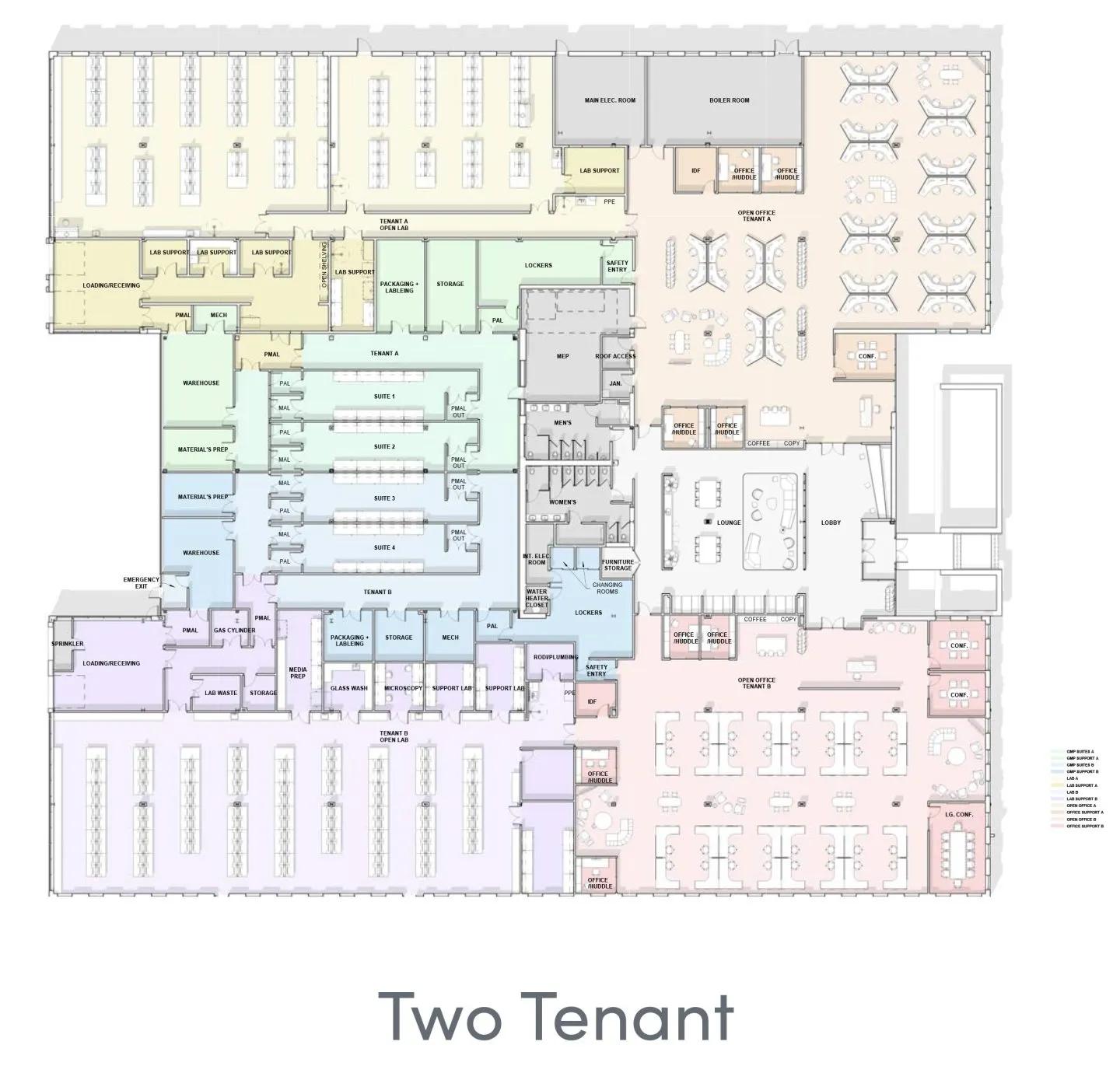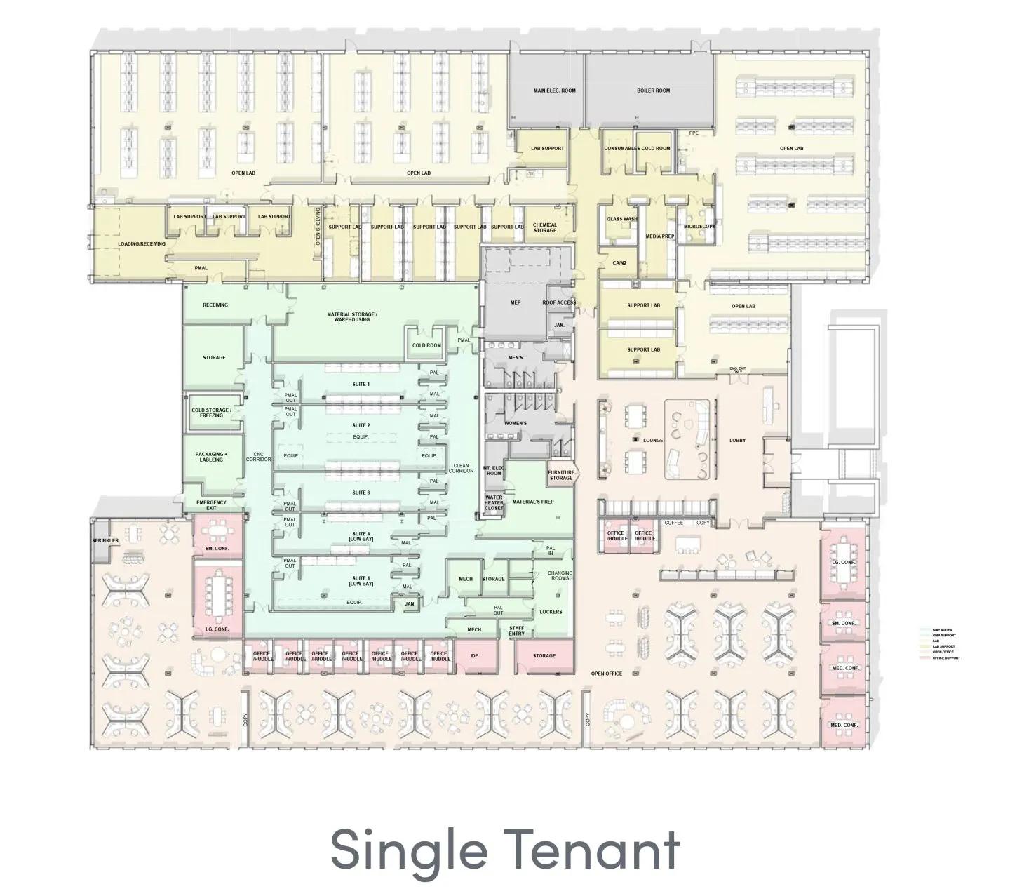 HVAC: Four dedicated, gas-fired rooftop units for office and one additional packaged rooftop unit dedicated for lab space (ISO7 capable) with energy recovery unit