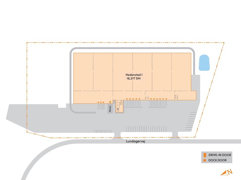 With a total area of 16,377 square meters, this premier distribution space is located directly along the E45 motorway. The property features 16 docks, an 8-meter warehouse clear height, and a low site coverage of 34%, providing seamless accessibility and manoeuvring space for extended combination vehicles. Additionally, there is outdoor storage space available.