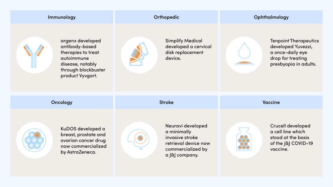 - argenx, the biotech company we backed in 2009 as part of a €9.5m investment round. Known for its antibody engineering expertise, argenx went public on Euronext Brussels and the Nasdaq in 2014 and 2017, respectively, becoming one of Europe’s most valuable biotech companies. Today it has a market cap of about €40bn.