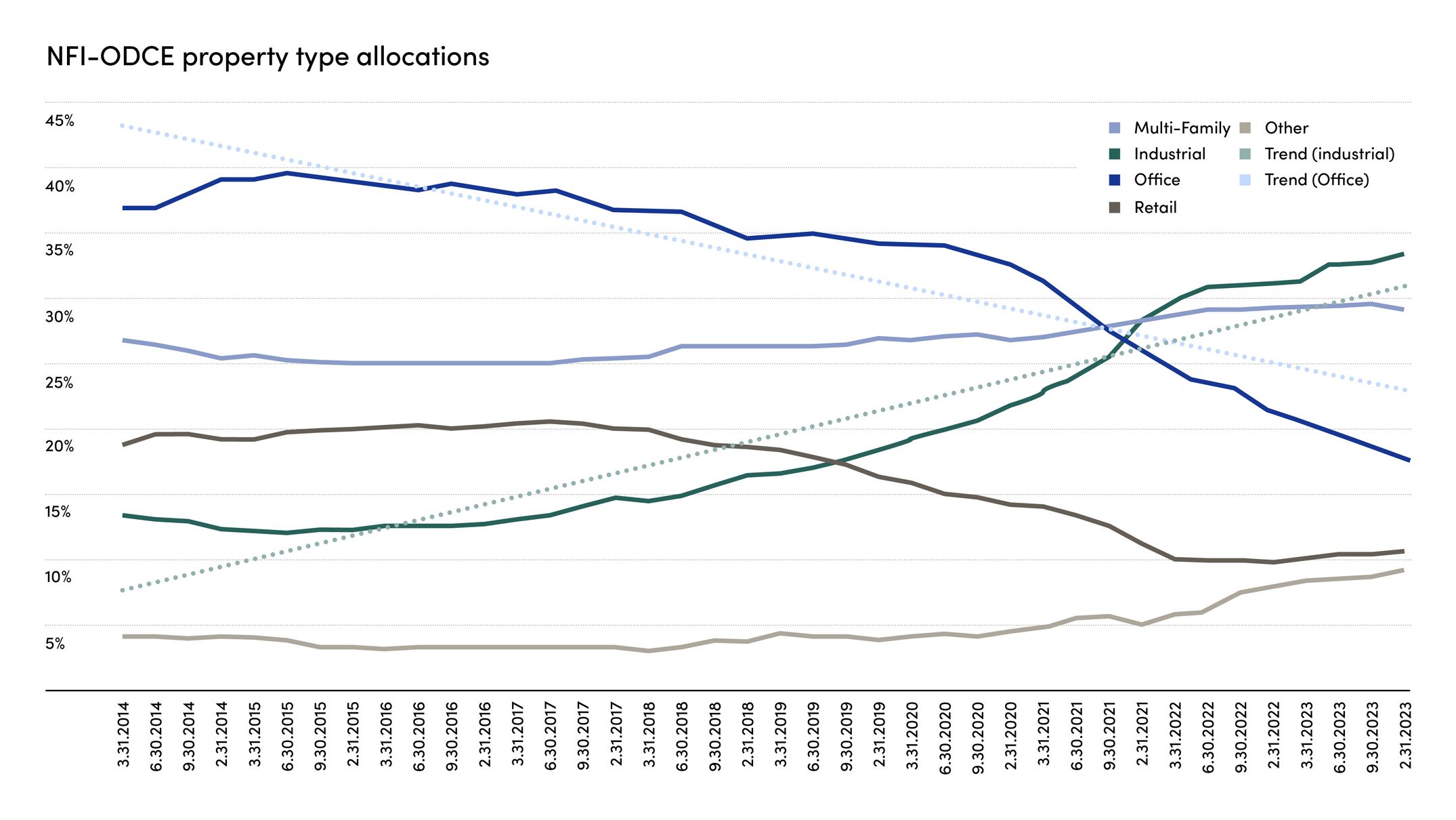 The effect of these trends on the relative appetite for office, retail, and industrial real estate investment can be seen by breaking down the NFI-ODCE index, which tracks the performance of about 25 private real estate funds. In 2014, the constituents of the index had about 20 percent of their money in retail, 14 percent in industrial, and 37 percent in office. As of September 2024, the allocations shifted to 11 percent in retail, 34 percent in industrial, and 17 percent in office.